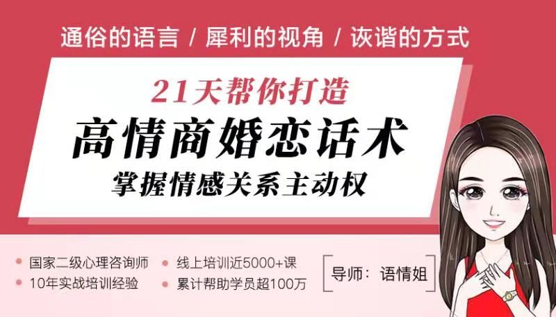 跟着语情老师,用21天修炼高情商感情话术,12节音频+30个核心要点+10大情景切入话术模拟,让你比想象中的情商更高。有空的时候听一听,轻松学会撩心话术,解决一切情感难题!