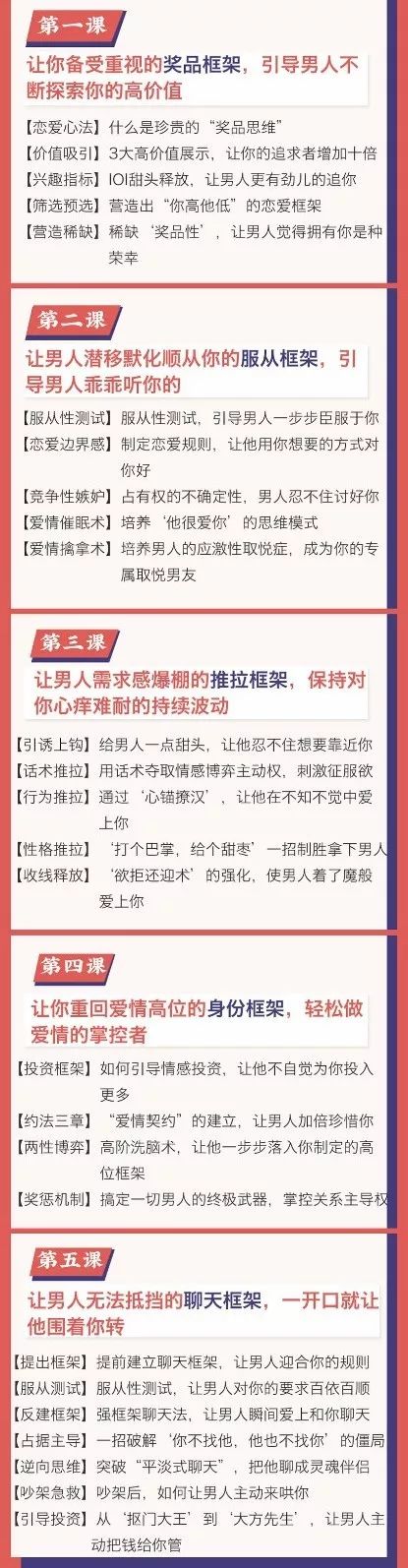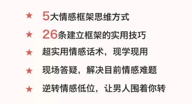 为了帮助大家更好地理解和学习“建立框架”,我们请来了两位资深的情感导师,从奖品框架、服从框架、推拉框架、身份框架和聊天框架这五个方面进行分析、指导;还有讲师答疑解惑的环节,可以跟他们线上互动沟通。