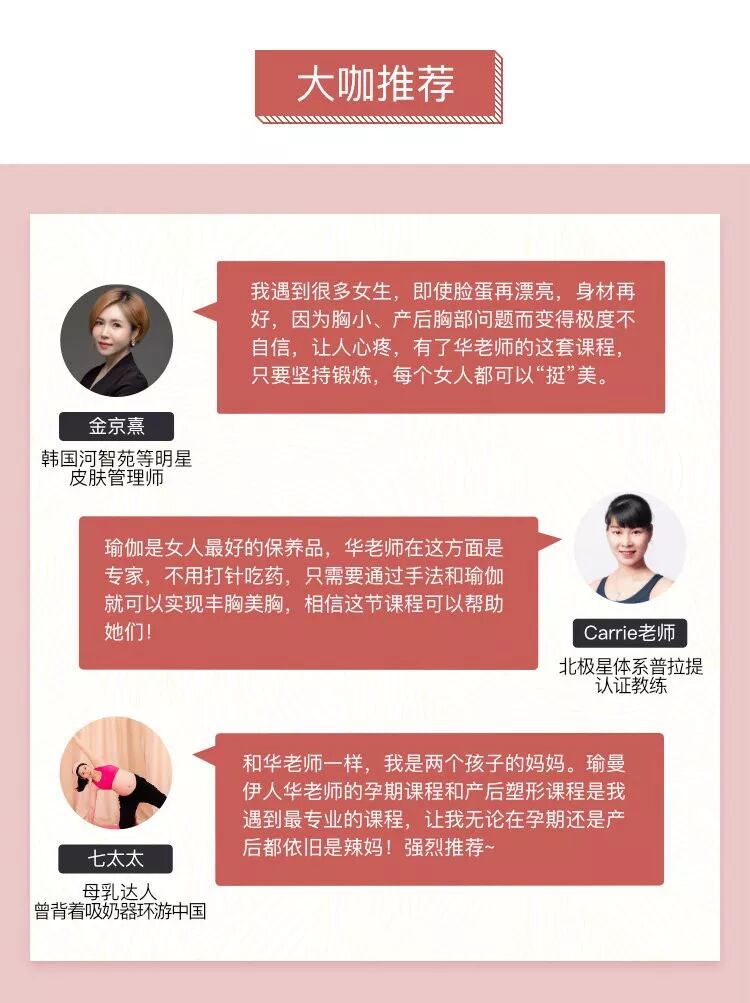 1、安全。不用吃药,不用动刀。华老师独创丰胸术,瑜伽运动+独创手法+饮食配合,所有动作食物都是纯天然。