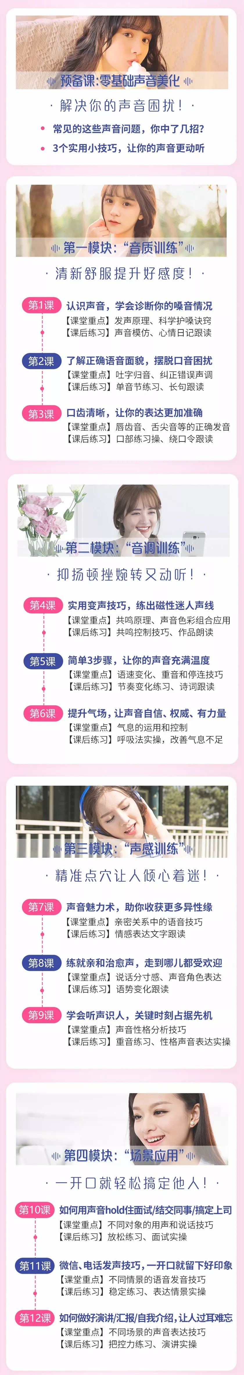 课程以4大核心主题、7种实用生活场景教学,通过12节精品美声课详细讲解超过50个声音美化技巧,让你在2周时间内就能轻松练出动听好声音: