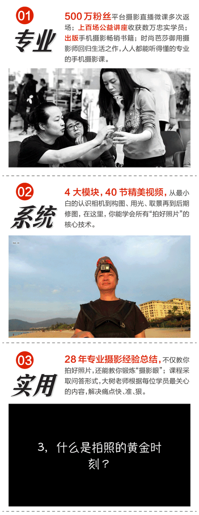 4大模块,40节精美视频,从最小白的认识相机到构图、用光、取景再到后期修图,在这里,你能学会所有“拍好照片”的核心技术。