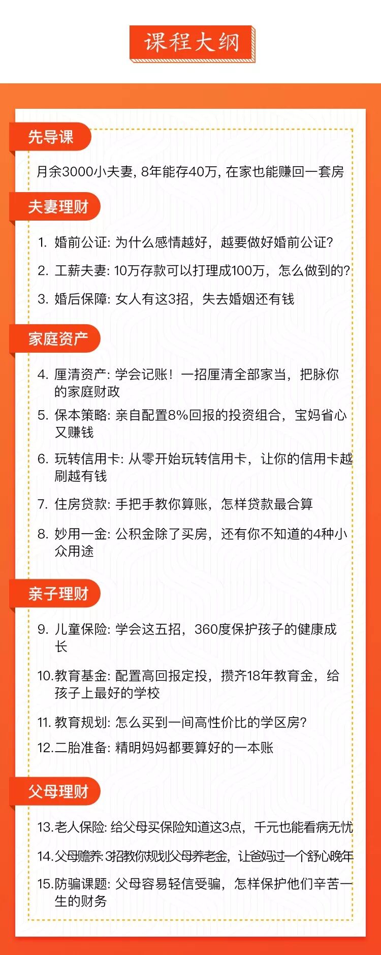 而这次的家庭理财课,和以往所有的理财课都不同,专门为女性量身制作。在学习的过程中,你将发现,理财这门学问不难学,而且一旦学会,你的生活将彻底改变。