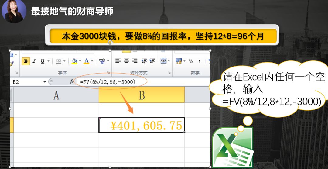然后利用Excel表里面最常用的FV公式计算一下。打开Excel表,在任意一个格子里输入=fv(8%/12,8*12,-3000,0),其中8%/12等于是月回报率,8*12等于说是8年的时间96个月,然后按下回车键,看看结果是多少?对啦就是40万多一点。