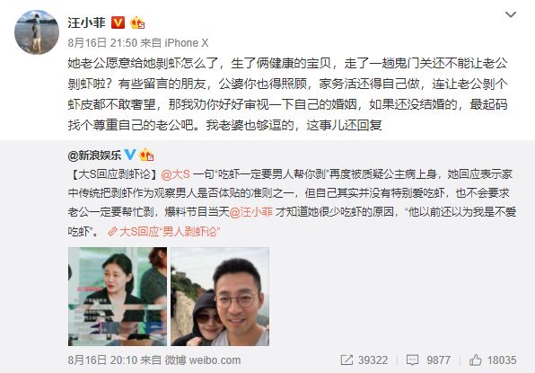 看到这些负面评论的汪小菲,发微博实力“护妻”,直说这是一个女人应该有的表现,自己就是喜欢这样淘气的爱撒娇的大s。