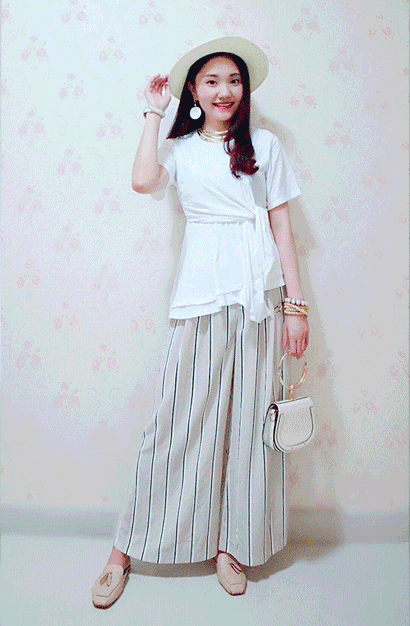 然后再选择紧收腰的款式,能很好地突出她腰部比较细的优势。整体效果跟下半身对比起来会显得腰特别细,让人关注度在腰部以上。