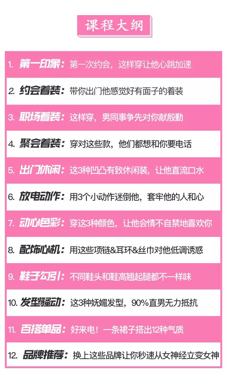 2. 课程不讲大道理,只讲实操方法,针对约会、聚会、职场、商场等常见场合,直接给出几个搭配公式,零基础的女生都可以直接套用,50、60分的形象立刻变成80、90分,这意味着你的“撩汉力”直接提升。