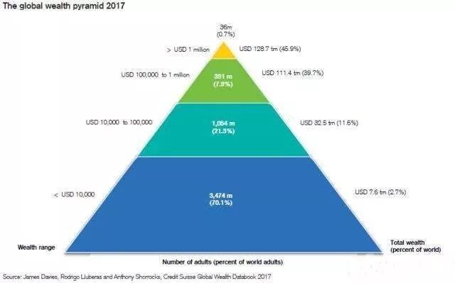2017年的瑞银《2017全球财富报告》中显示:全球最底层的人群,拥有的财富不足全球整体财富的1%;全球最富有的10%人口,拥有全球总资产的88%;最富有的1%人口,更是占据了全球一半的家庭财富。