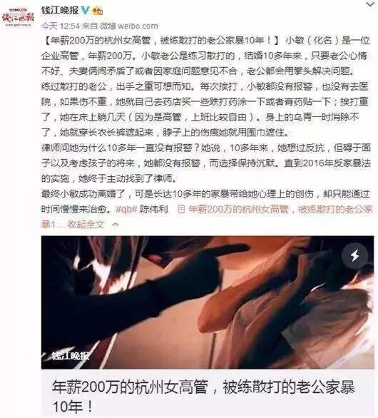 2017年,杭州一位年薪200万的女高管日记曝光,在她的记录中,练习散打的丈夫对她长期施以家暴,一打就是10年。